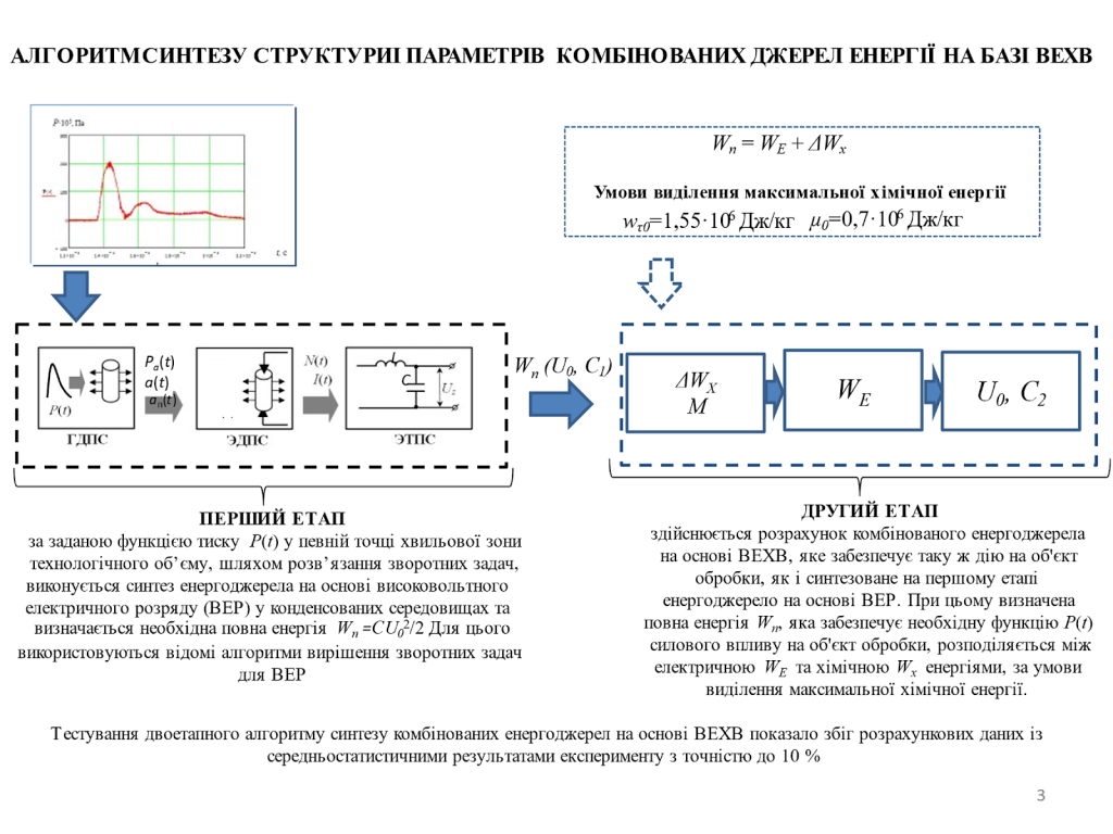 3. Спираючись на результати проведених теоретичних і експериментальних досліджень вперше розроблено алгоритм синтезу комбінованих енергоджерел на основі ВЕХВ для конкретних РІТ, що забезпечують необхідний просторово-часовий силовий вплив на об’єкти обробки при мінімальних енергозатратах. Використання розробленого алгоритму дає змогу забезпечити виконання необхідних технологічних задач, зменшити масогабаритні показники енергетичного обладнання, підвищити продуктивність та знизити щонайменше  у 1,5 рази енергоємність розрядно-імпульсних технологій (РІТ), які широко використовуються в промисловості.