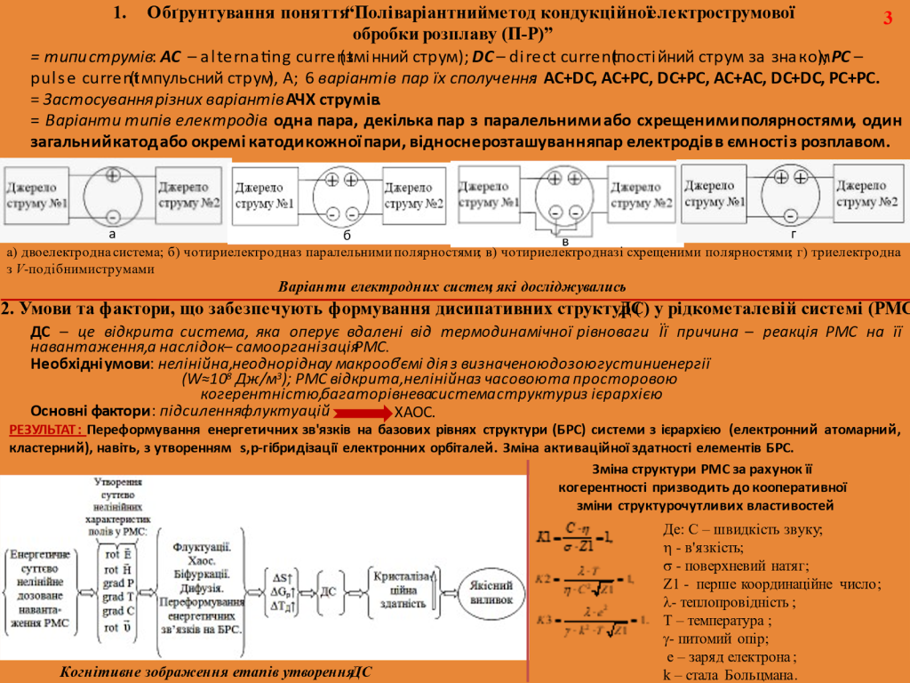 Для реалізації цього методу можливо використовувати декілька десятків варіантів комбінацій елементів системи «Електроди – Типи струмів», тому для запропонованого методу можна використовувати поняття «Поліваріантний метод кондукційної електрострумової обробки розплаву» (П – Р).