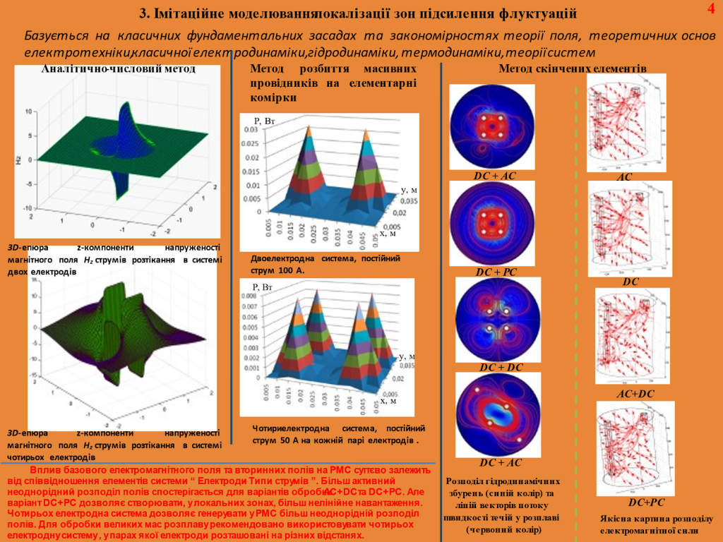 Для наукового обґрунтування П–Р вперше виконано цикл досліджень методами імітаційного моделювання та фізичного експерименту, результати яких довели широкі функціональні можливості методу. За різних комбінацій елементів системи «Електроди – Типи струму» у РМС утворюються фізичні поля (електромагнітні, акустичні, теплові та поля течій), числові значення АЧХ яких можуть різнитись у декілька разів, а топологія якісно суттєво відрізнятись.