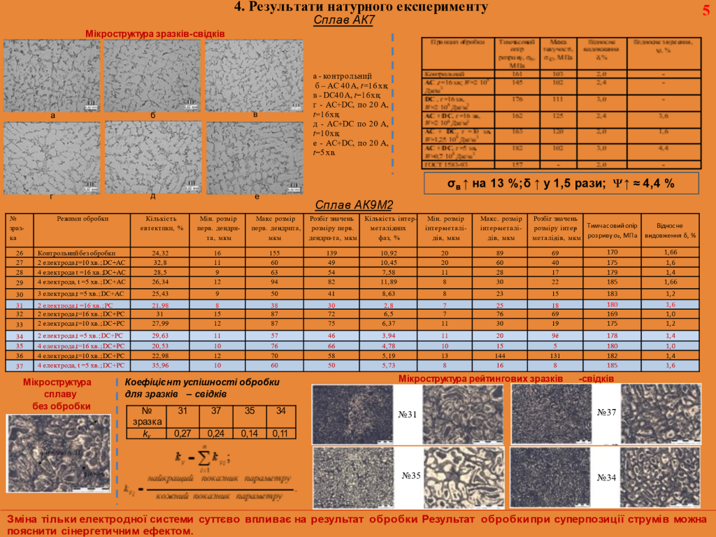 Експериментальні дослідження виконано при обробці рідкого стану сплаву АК7 та сплаву, близького до складу з АК9М2. Керуючись результатами імітаційного моделювання, обробку виконували струмами АС, ДС, РС та їх сполученням. Отримані результати підтвердили припущення імітаційного моделювання (МСЕ), що для обраного навантаження найбільш сприятливим є сполучення АС + DC та DC + РС. Але другий варіант дозволяє генерувати у розплаві більш нелінійне та неоднорідне ЕМП та вторинні поля. Як наслідок – покращується успішність обробки. В роботі для її визначеності запропоновано використовувати коефіцієнт успішності, який враховує сумарно показники механічних властивостей та мікроструктури. Для сплаву АК7 тимчасовий опір σв виріс на 13 %, відносне видовження δ збільшено у 1,5 рази, а відносне звуження Ψ – отримано на рівні 4,4 %. Для сплаву АК9М2 σв виріс на 10 %, інтерметаліди суттєво здрібнено. Експерименти (post factum) довели наявність сінергетичного ефекту – енерговитрати зменшено практично у 3 рази у зрівнянні з обробкою одним типом струму. Крім того, для П-Р загальні енерговитрати не перевищують 30 кВт·год/т.