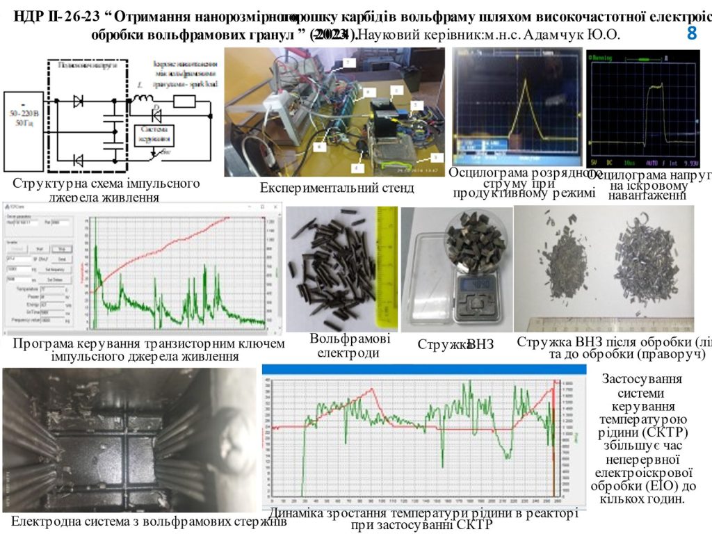 НДР II-26-23 «Отримання нанорозмірного порошку карбідів вольфраму шляхом високочастотної електроіскрової обробки вольфрамових гранул», № ДР 0123U102989, 2023 – 2024 рр. Робота виконувалась за цільовою програмою «Науково-дослідні роботи молодих учених НАН України 2023-2024 рр.», науковий керівник – Адамчук Юрій Олегович, молодший науковий співробітник.