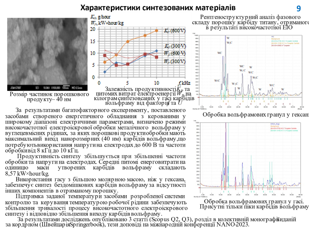 – Розроблено рекомендації стосовно вибору вихідних електричних характеристик джерела імпульсів струму та хімічного складу вуглецевмісної робочої рідини для максимально продуктивного отримання нанорозмірних карбідів вольфраму.