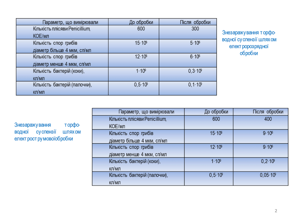 – Визначено, що результатами послідовного комплексного впливу високовольтних електророзрядних імпульсів та низьковольтного імпульсного струму на слаболужну суспензію «торф-воданатрію гідрокарбонат» є 30-кратне подрібнення часток твердого рослинного субстрату впритул до 10 мкм, приблизно 5-кратне зменшення вмісту бактерій і 2-3-кратне зменшення вмісту шкідливих грибкових організмів в торф’яних суспензіях, наостанок – підвищення кількості екстрагованих з торфу гумінових кислот до 17%.
