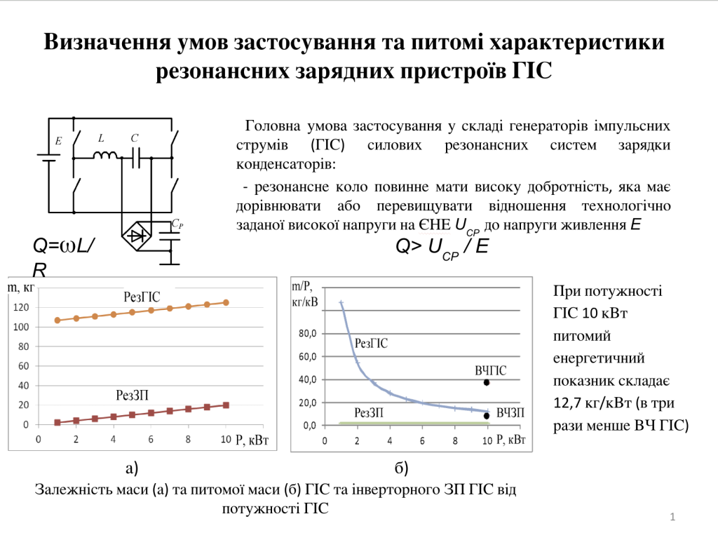 – Розроблено принципи побудови високовольтних безтрансформаторних систем зарядки ємнісних накопичувачів енергії (ЄНЕ) для електророзрядних технологій, а саме зарядних пристроїв генераторів імпульсних струмів (ГІС) на основі резонансних систем. Вони полягають у тому, що для досягнення високої напруги на ЄНЕ використовують підвищення напруги на конденсаторі послідовного резонансного кола відносно напруги живлення, а для зниження часу зарядки ЄНЕ, масогабаритних характеристик електромагнітних елементів та струму крізь транзистори для заданої потужності ГІС потрібно підвищувати частоту резонансного кола до частоти насичення fsat.